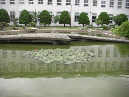 ここには亀も鯉もいます。 真ん中の橋を渡っている姿は、ちょっともの悲しかったり。 サギもいます。 本校舎へ